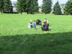 今回は、涼しく、過ごしやすい気候となったため、外で学生スタッフと一緒にシャボン玉をしました。