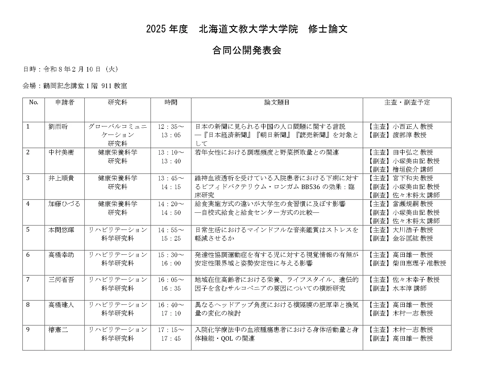 今年度も令和8年2月10日(火)に北海道文教大学大学院の合同公開発表会を開催します。