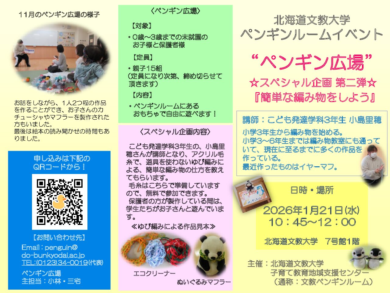 子育て教育地域支援センター(通称:文教ペンギンルーム)では、11月26日水曜日に、ペンギン広場③を開催しました。 今回は初めて、「アクリル毛糸でエコクリーナーを作ろう」というスペシャル企画も行いました。 こども発達学科3 […]
