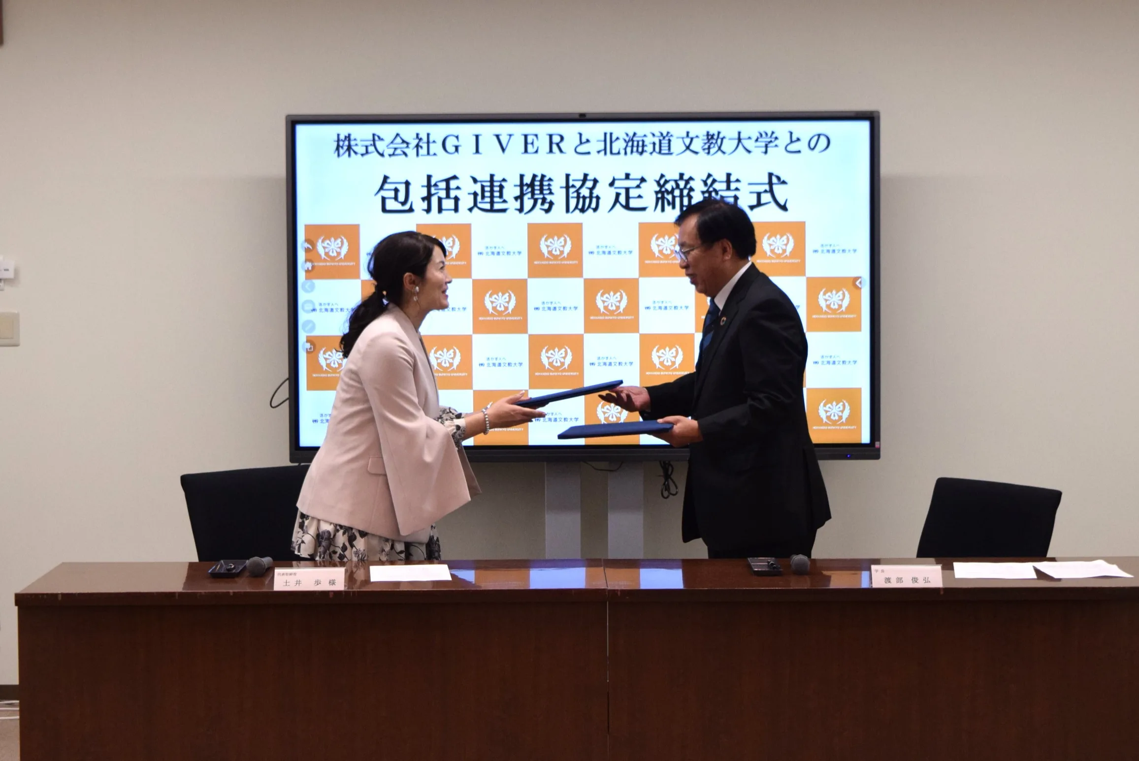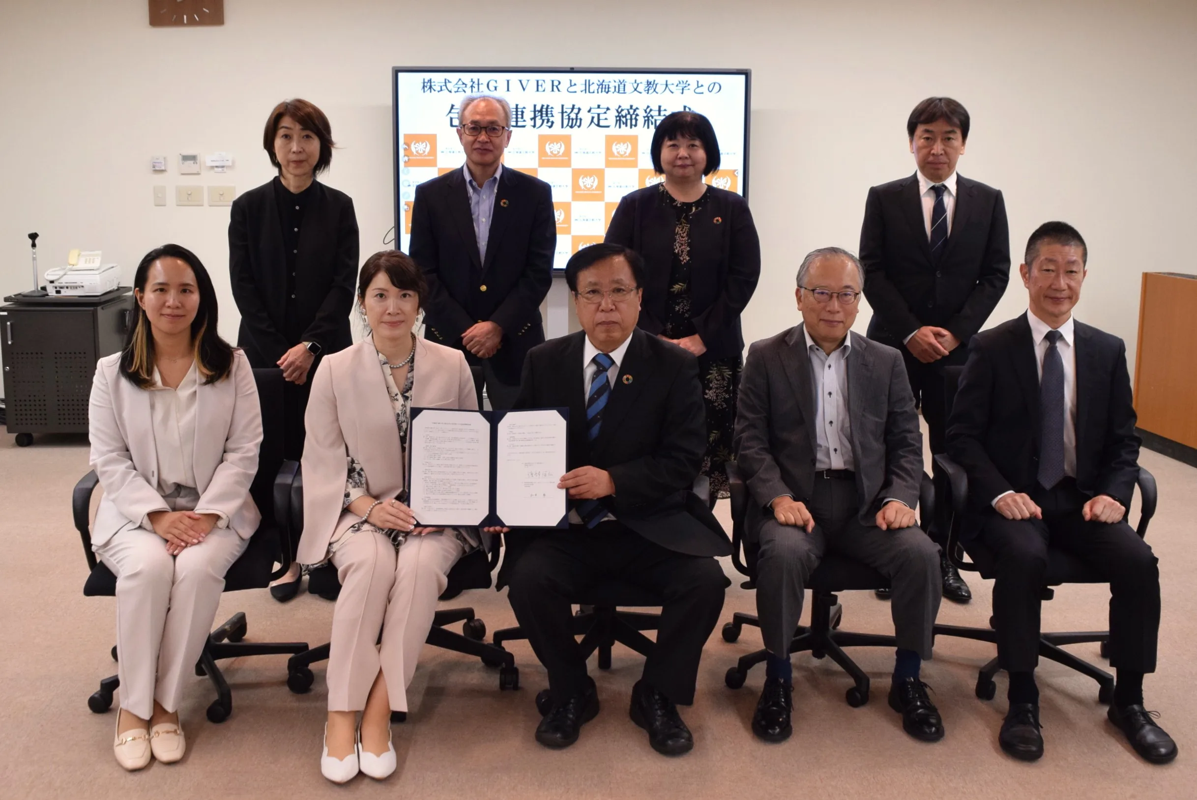北海道文教大学と株式会社GIVERは、株式会社GIVER及び北海道文教大学が有する人的・知的資源等を有効活用し、株式会社GIVERが取組むエシカル消費(倫理的消費)やジェンダー平等の普及事業を踏まえ、一人ひとりが輝き、尊重され、挑戦できる社会の実現に資する取組みを行うことにより、人材育成及び社会の活性化に寄与することを目的として、令和7年9月25日に連携協定を締結いたしました。 株式会社GIVER(2025年9月25日 調印)