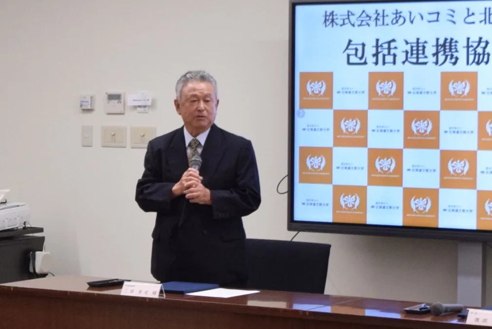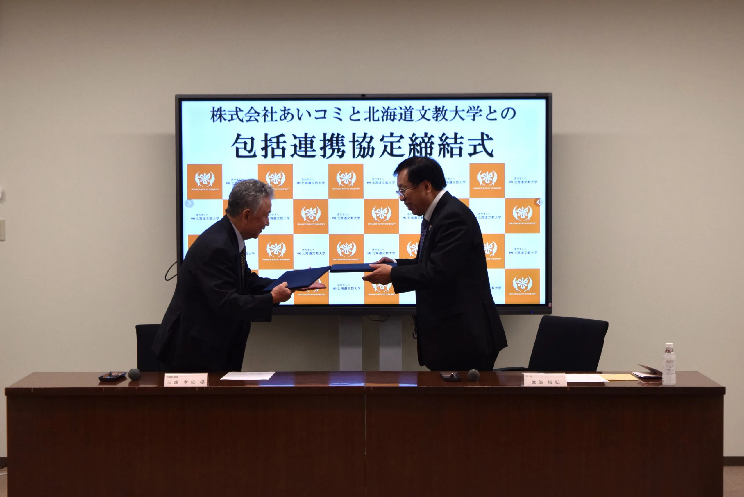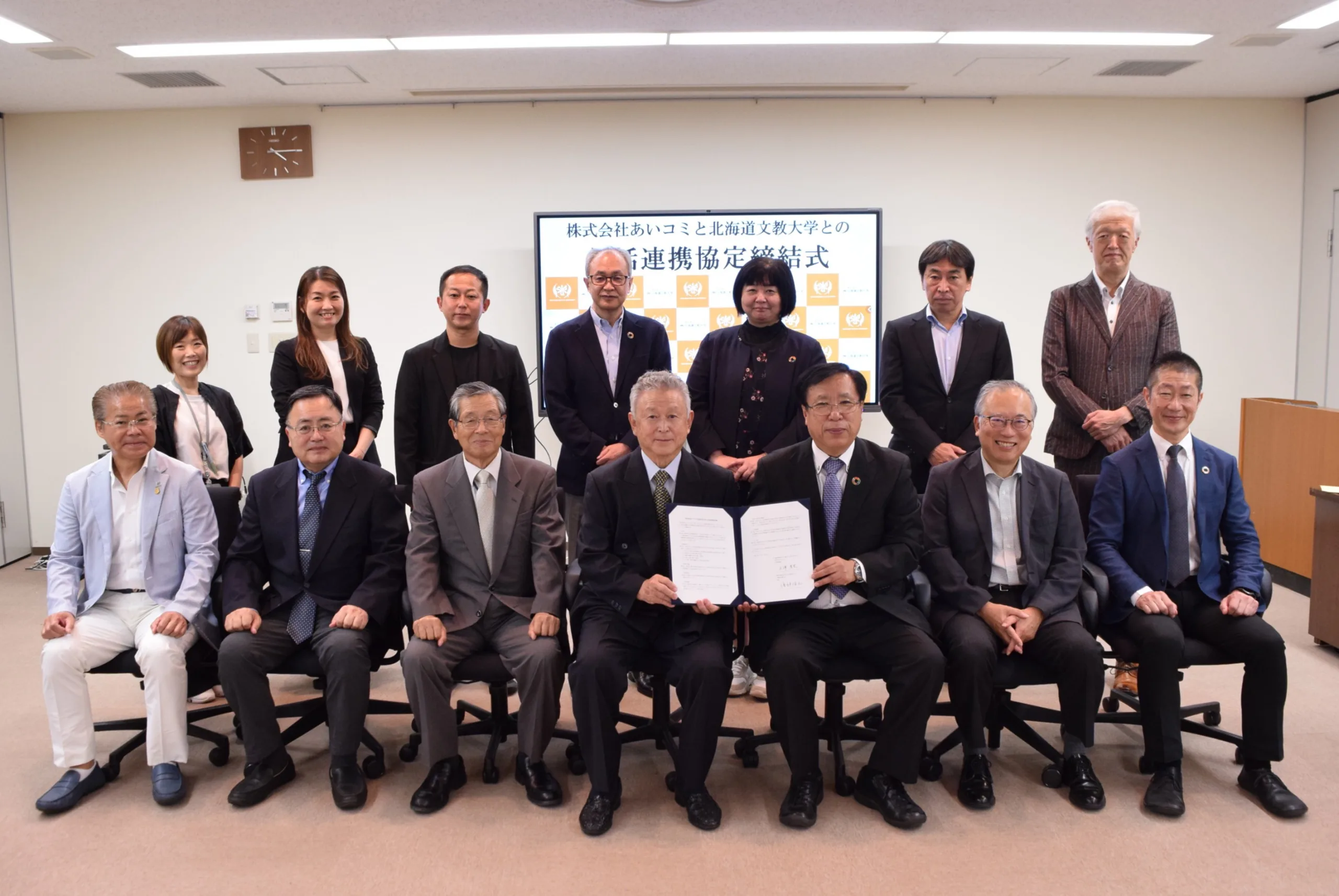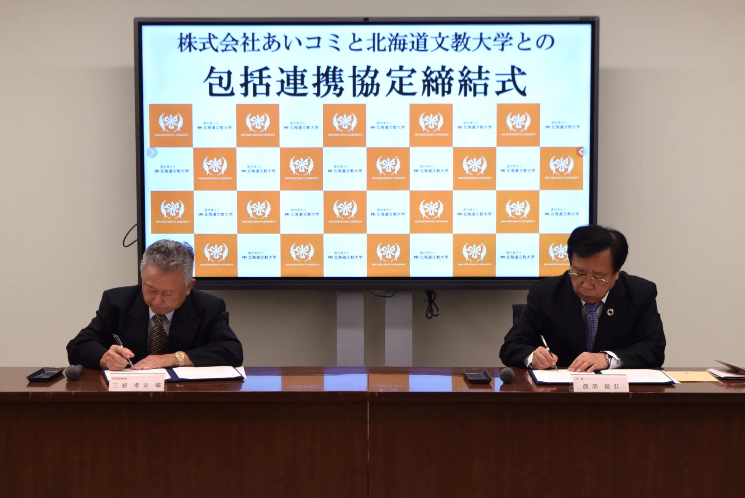 北海道文教大学と株式会社あいコミは、産学連携を通じ、株式会社あいコミが有する地域メディア企業(FM e-niwa)としての媒体機能と北海道文教大学が有する研究・教育機能等を連携させることにより、北海道文教大学の研究・教育機能等を地域住民の暮らしにより身近なものに近づけるとともに、地域の活性化につなげることを目的として、令和7年9月26日に連携協定を締結いたしました。 株式会社あいコミ(2025年9月26日 調印)
