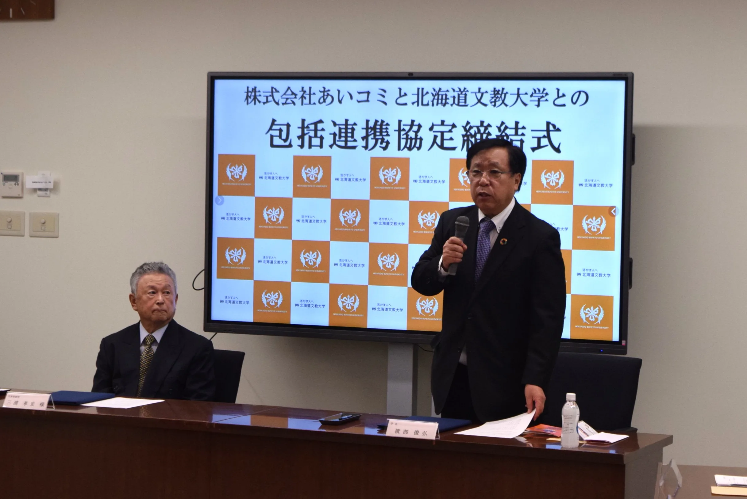 写真左 株式会社あいコミ 代表取締役 三浦 孝史 様 、 同右 北海道文教大学 学長 渡部 俊弘