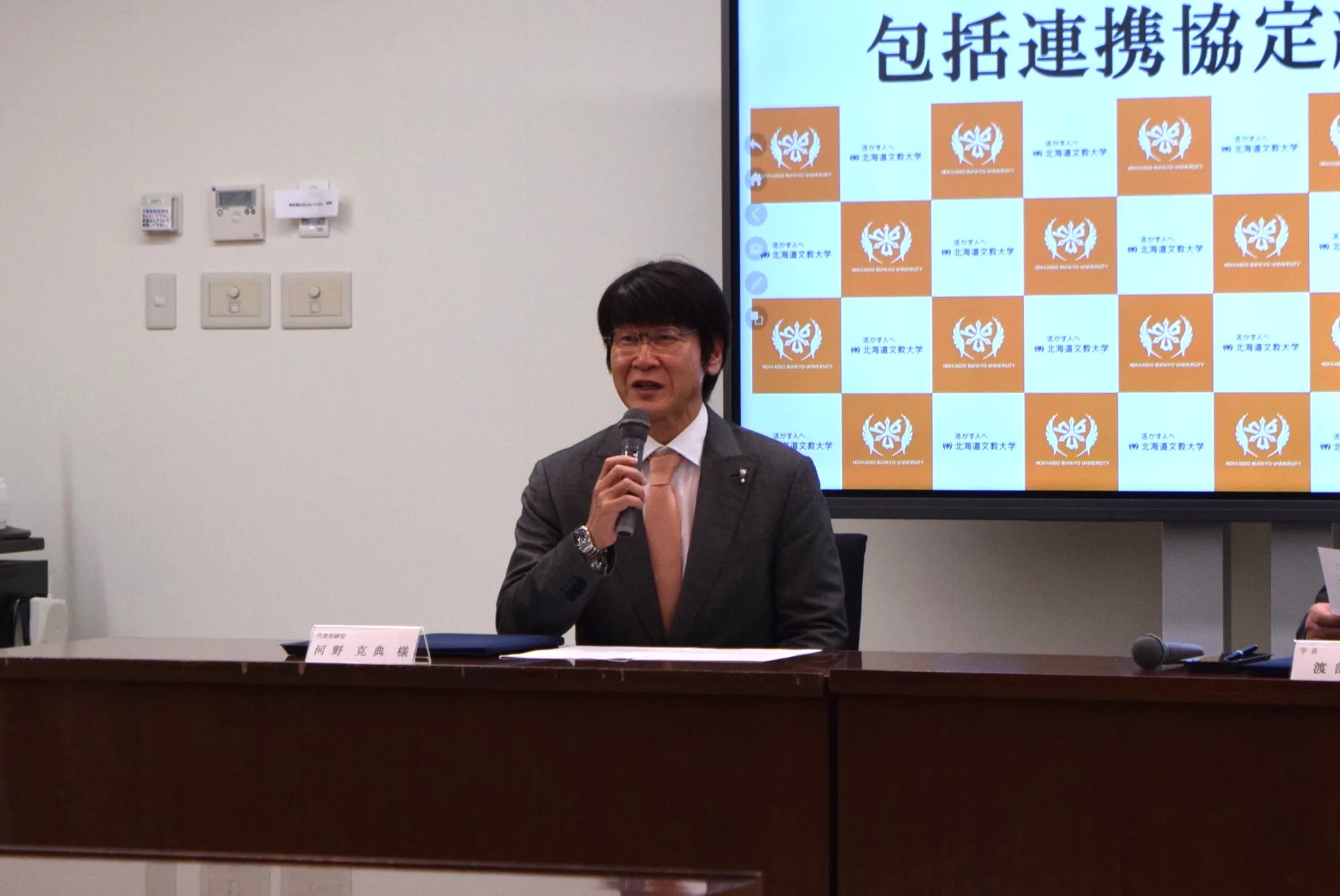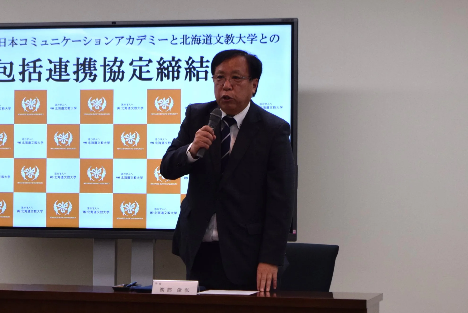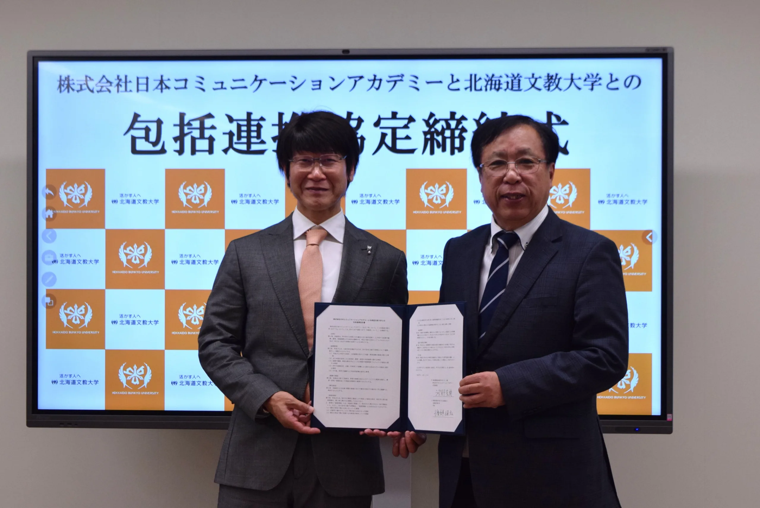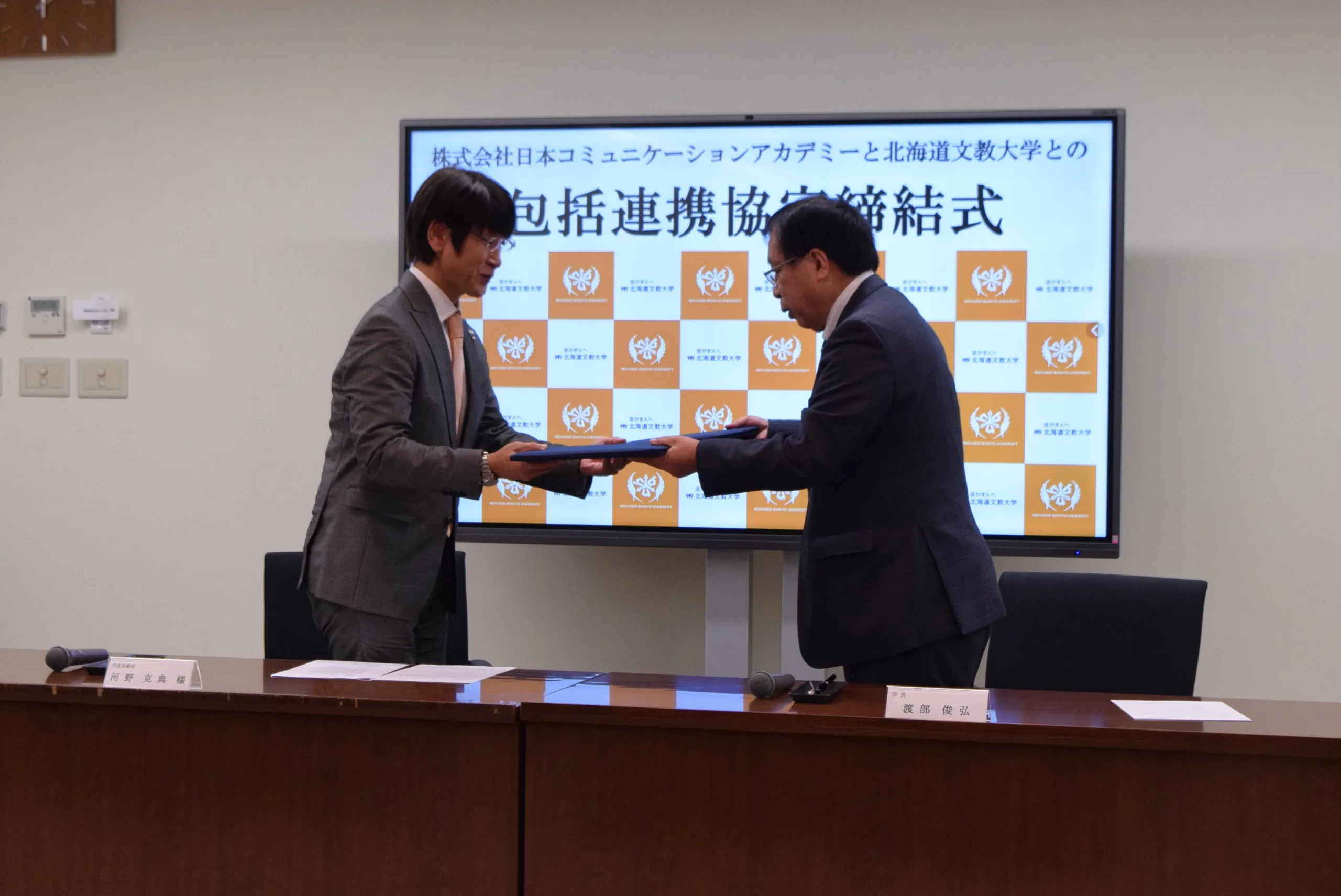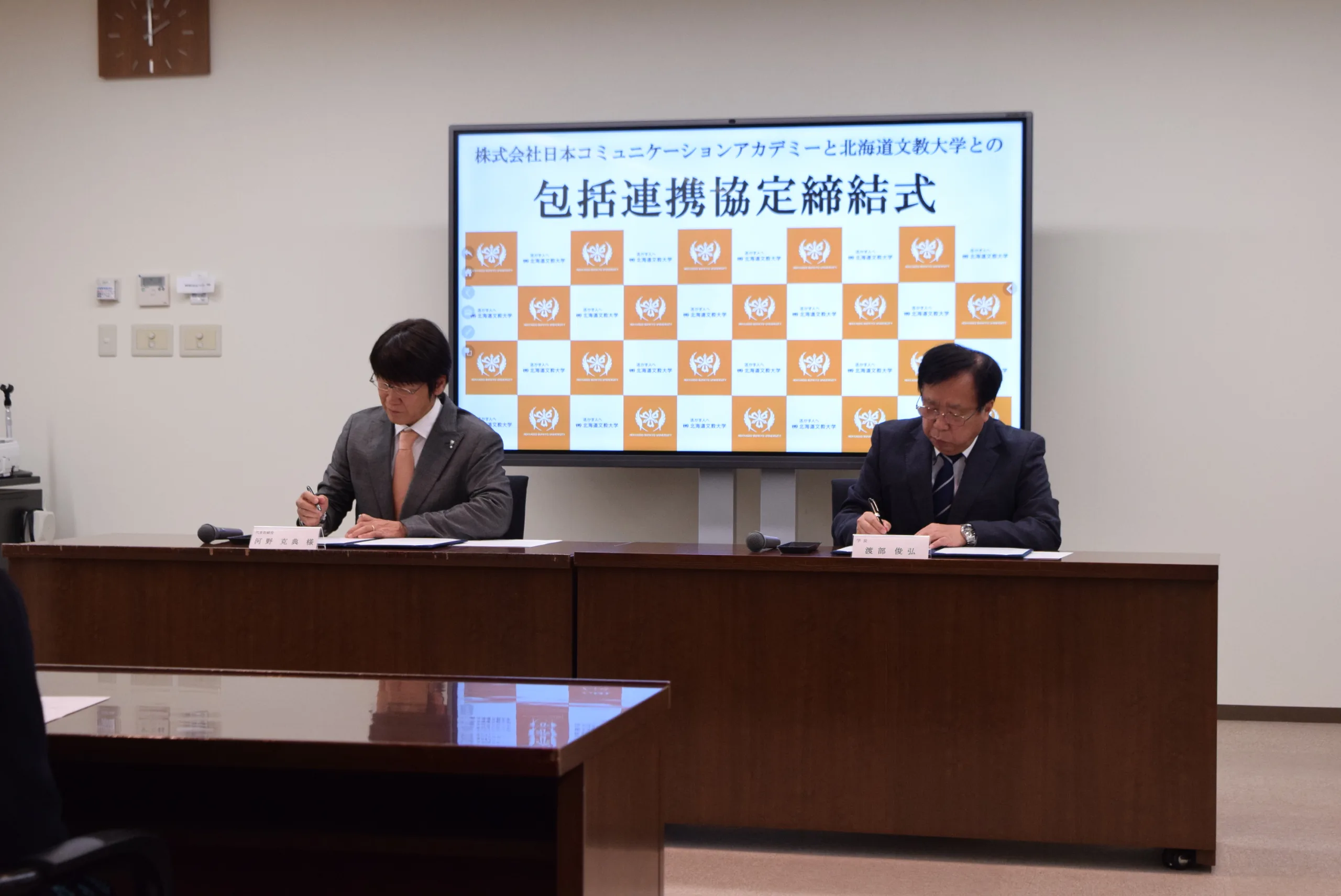 写真左 株式会社日本コミュニケーションアカデミー 代表取締役 河野 克典 様 、 同右 北海道文教大学 学長 渡部 俊弘